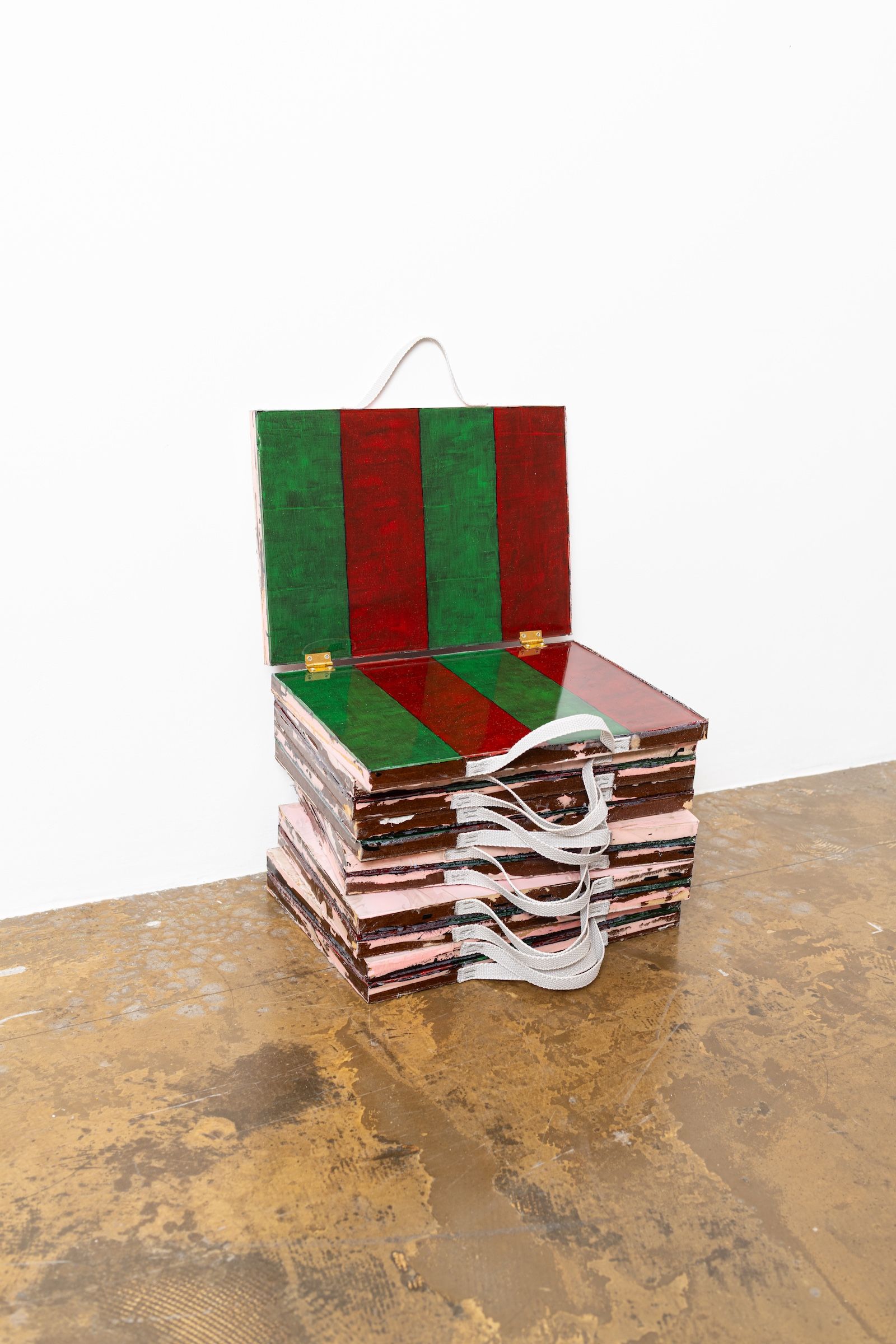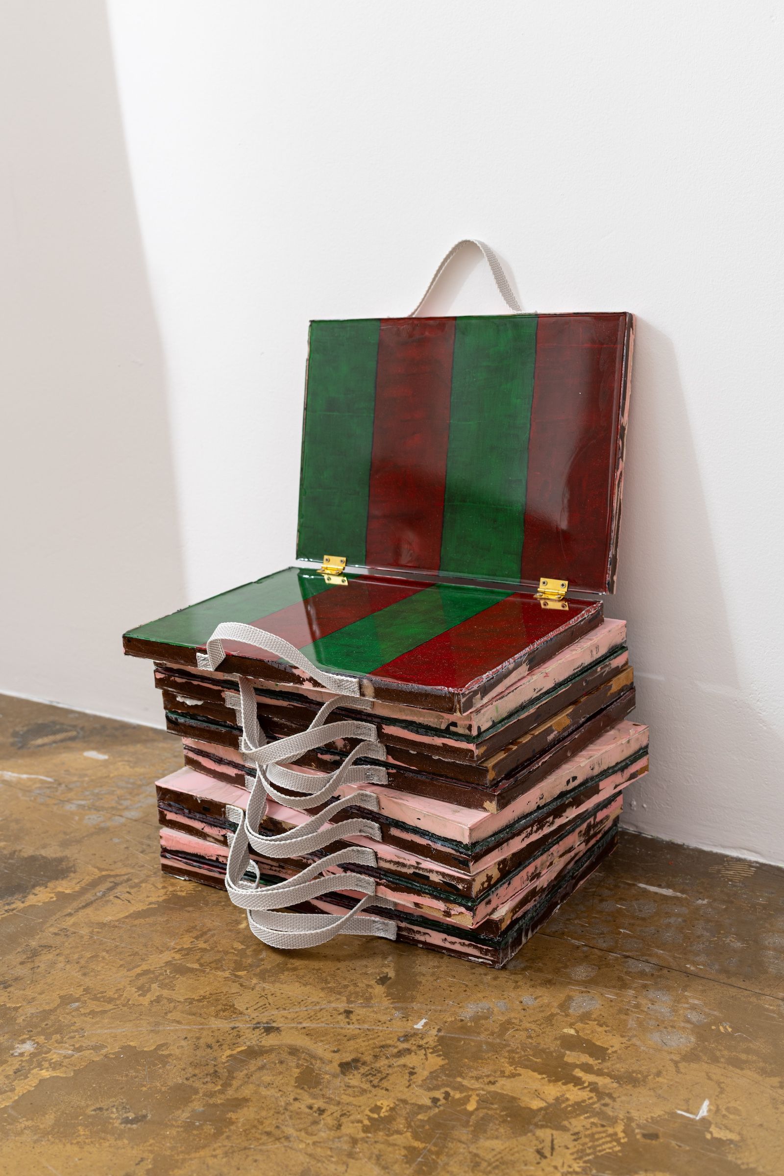 Acryl, Öl und Kunstharz auf MDF-Platten, geschraubte Scharniere, Tragegurte