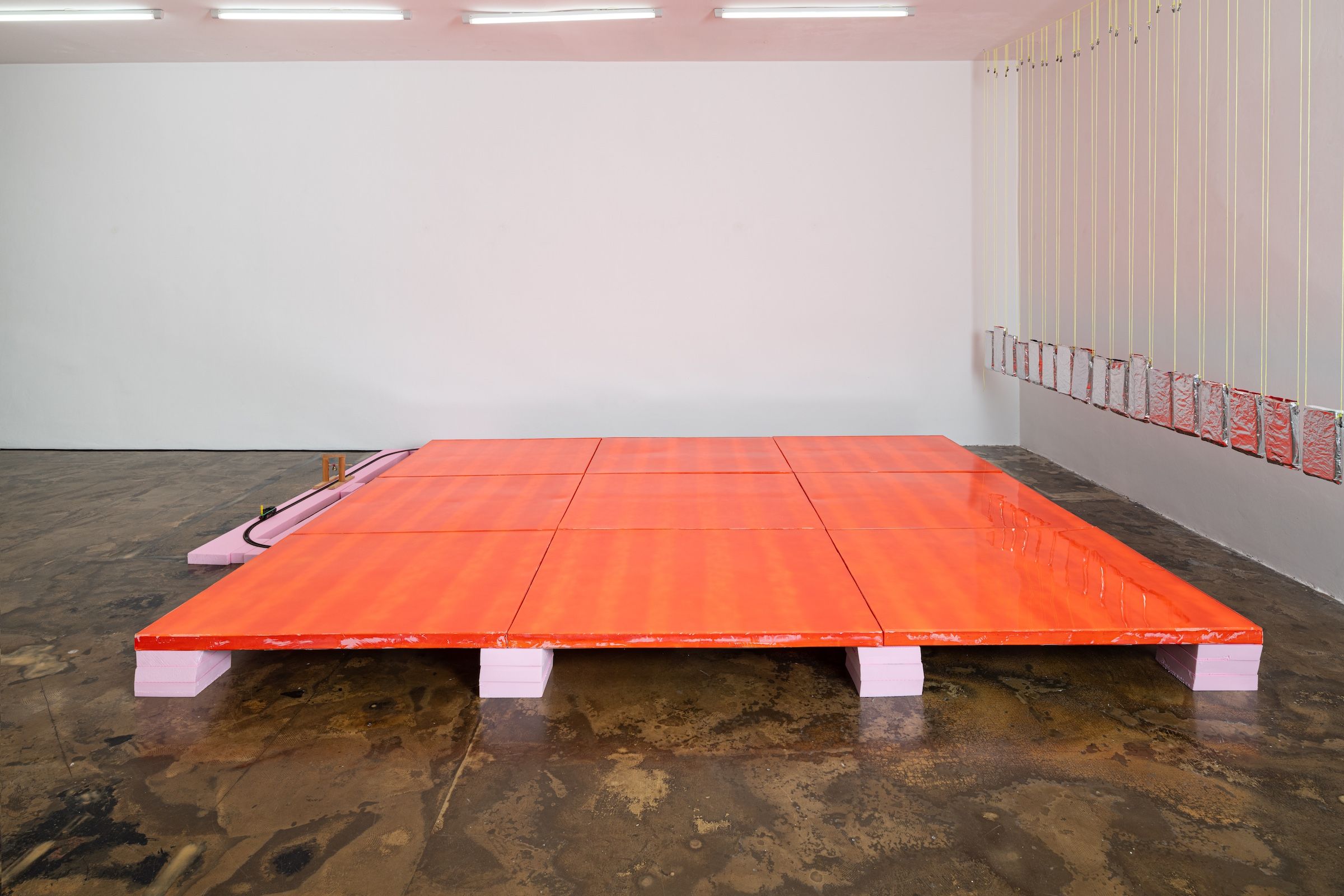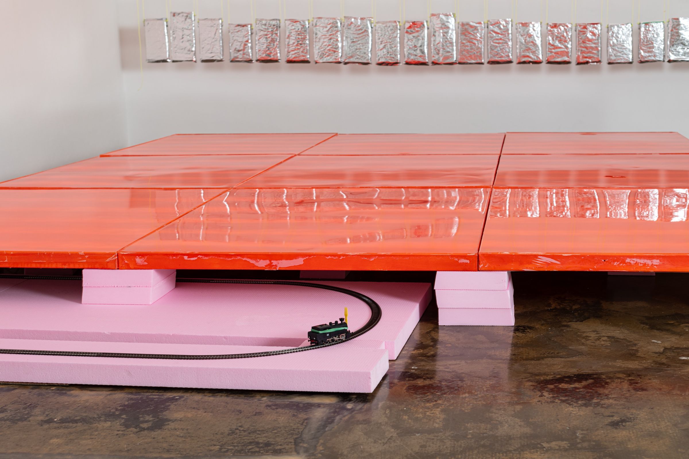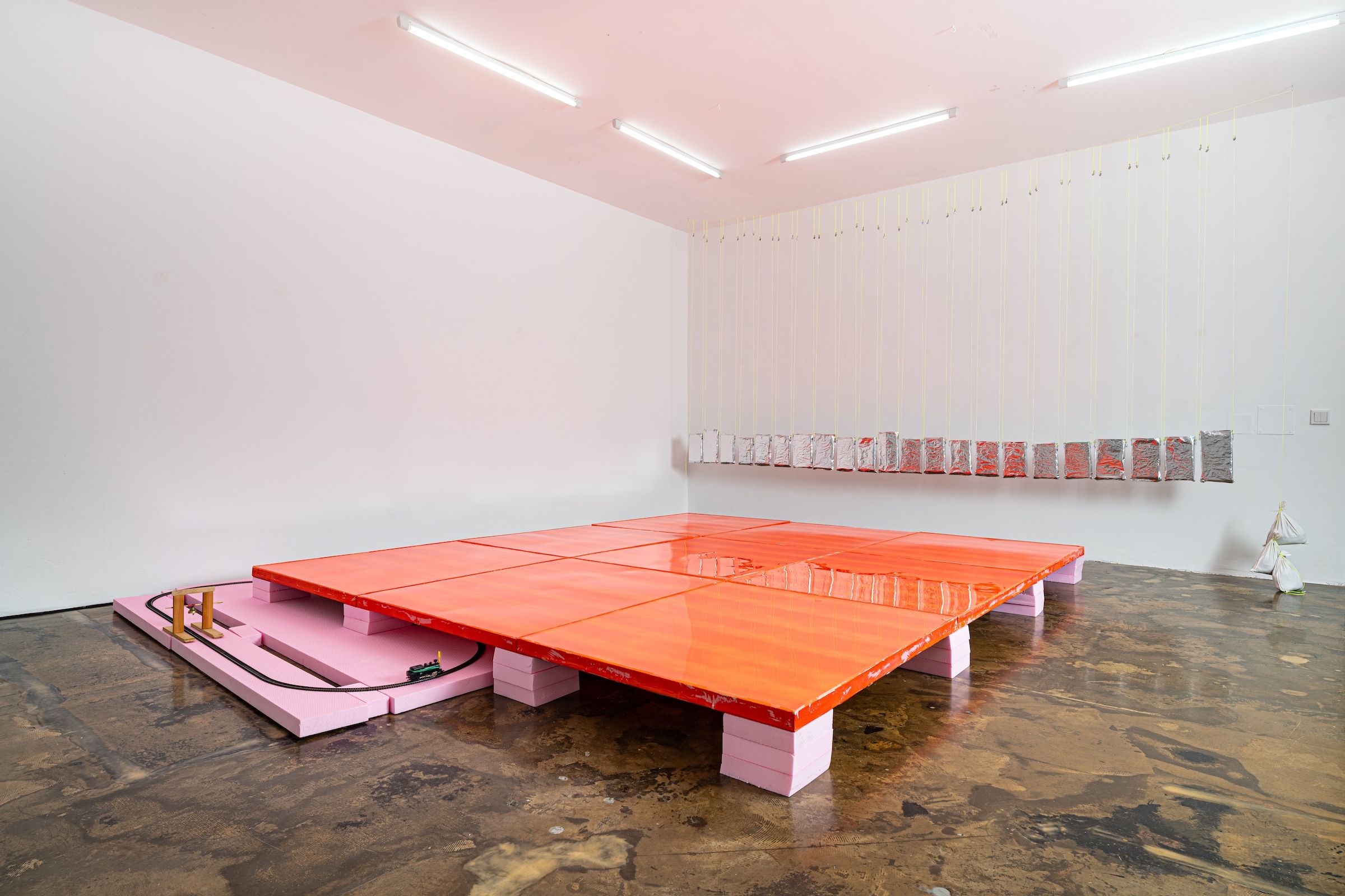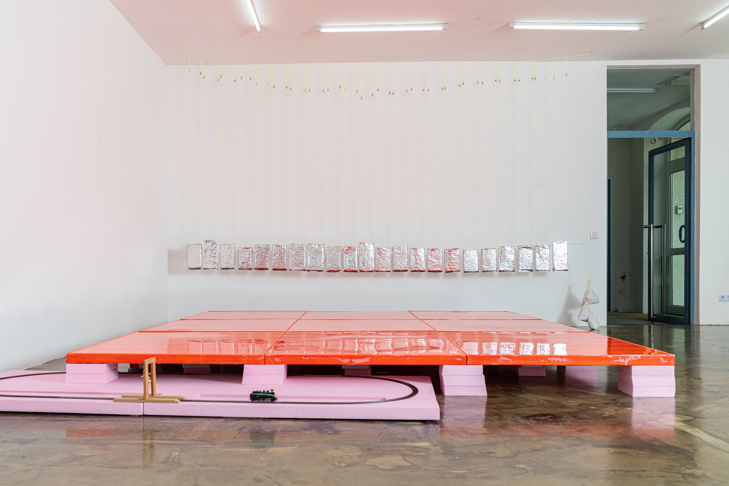 [1] awaiting tune of a windy yester, 2024/25, 21-teilige Serie. Auf links gedrehte (Abfall-) Snack-Verpackungen, Dämmstoffplattenreste, Draht, Garn, Montagehaken, Sandsäcke [2] I remind me of me, 2021/22, 9-teilige Serie je 120 x 100 cm. Acryl, Lack und Kunstharz auf Leinwand [3] the triumphant return of leaving, 2025, 180 x 90 x 23 cm. Modelleisenbahn, Hartschaumplatten, Holzgerüst mit Glocke, Pommesgabel