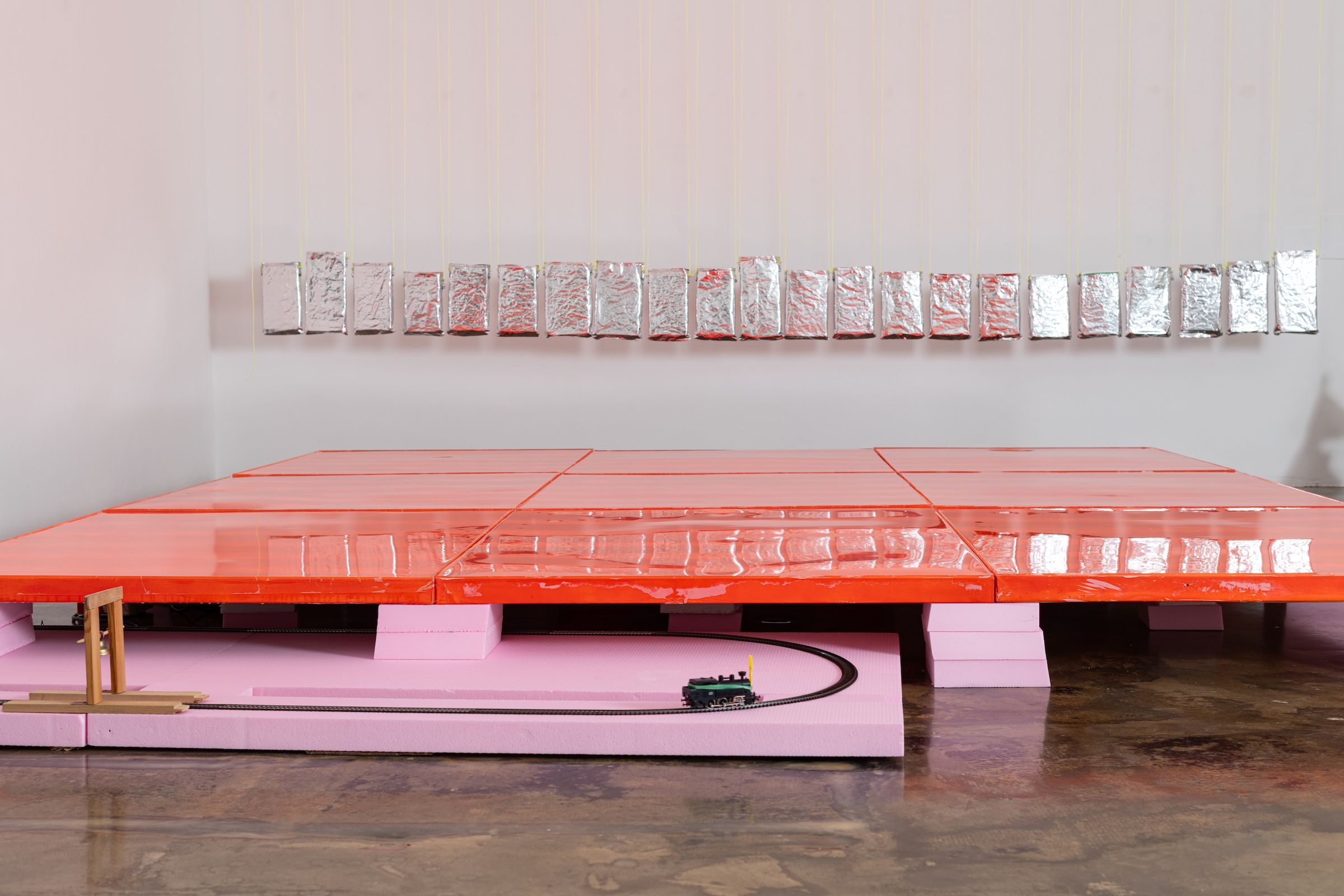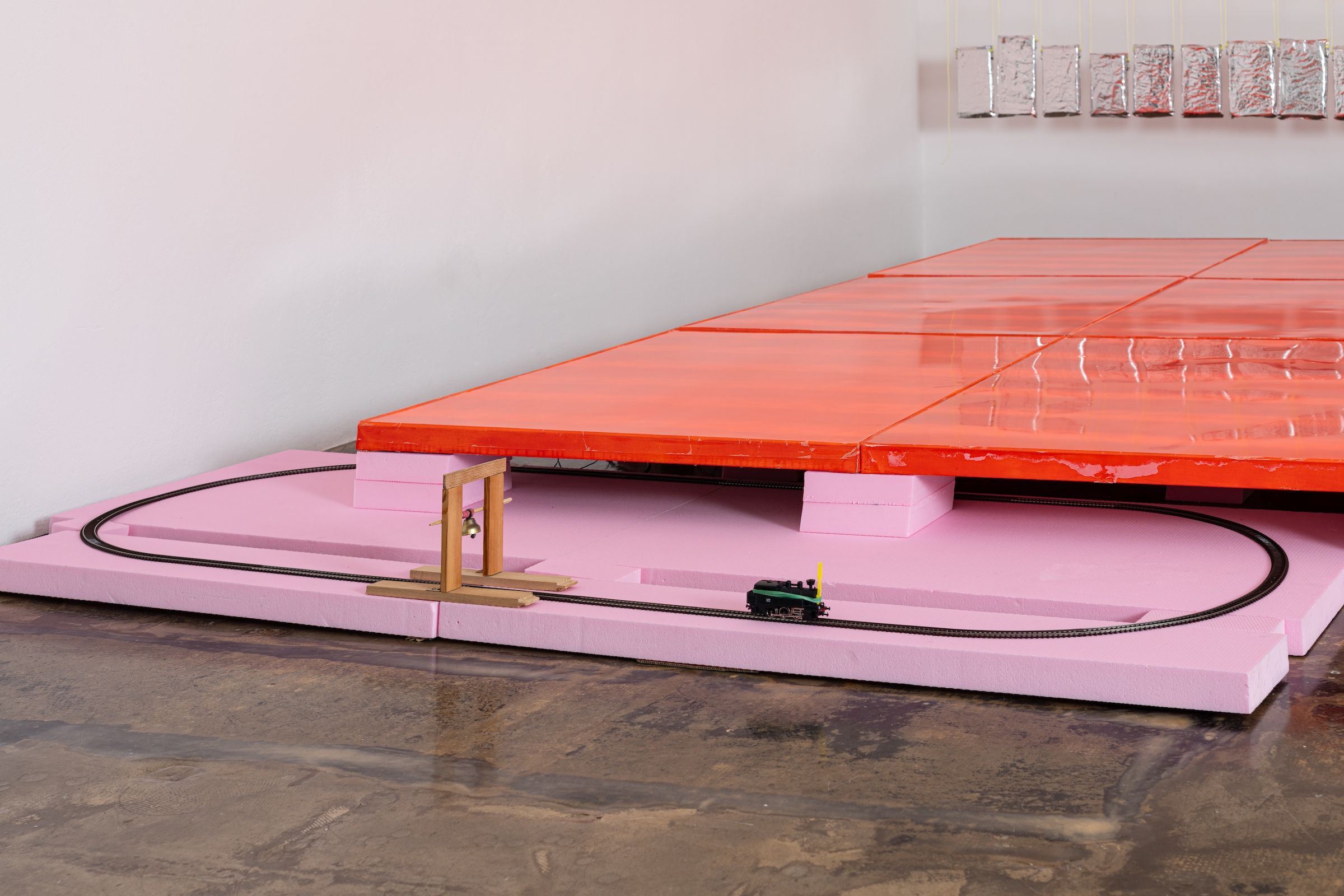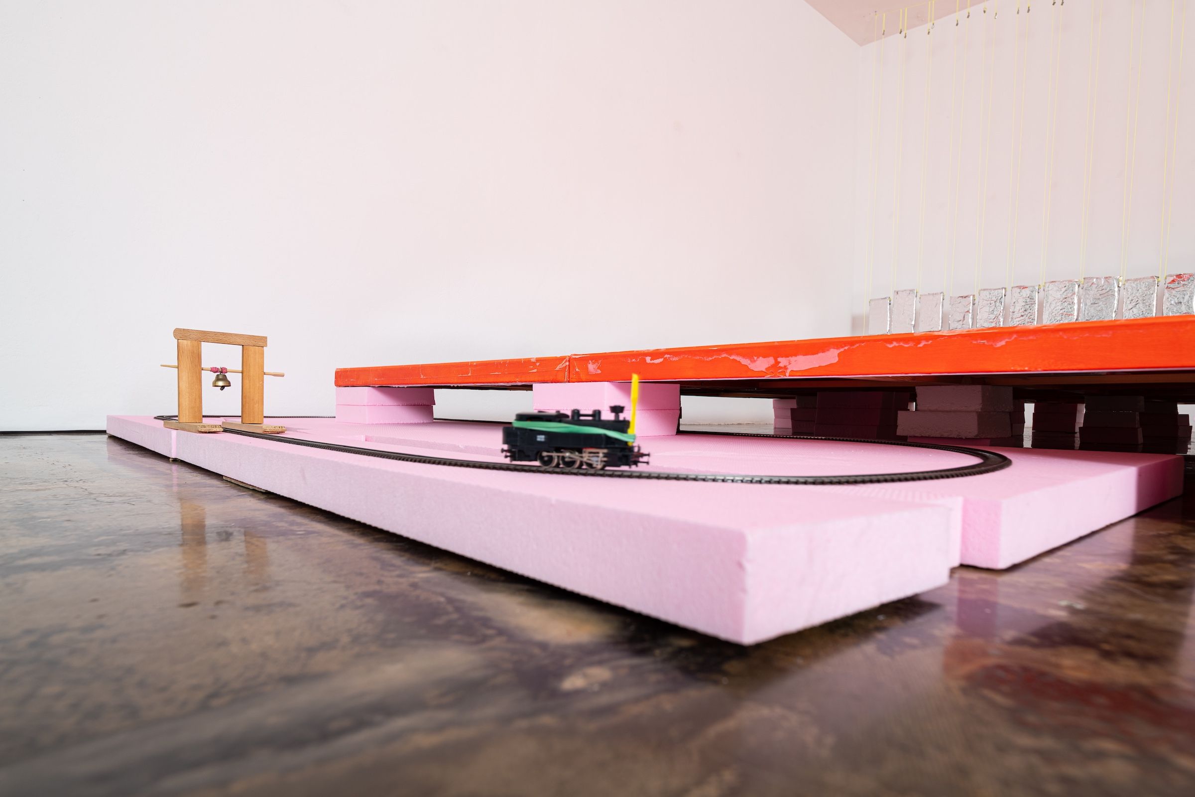 the triumphant return of leaving 2025 180 x 90 x 23 cm Modelleisenbahn, Hartschaumplatten, Holzgerüst mit Glocke, Pommesgabel