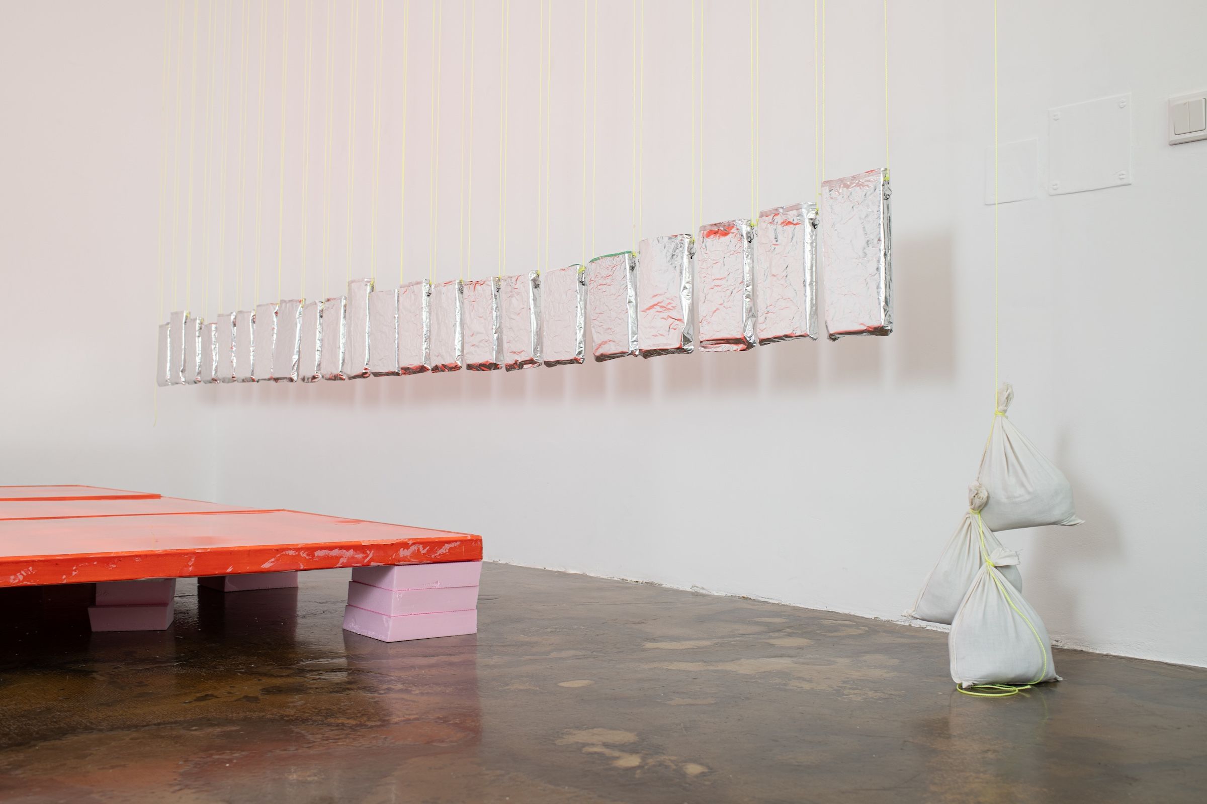 awaiting tune of a windy yester 2024/25 21-teilige Serie Auf links gedrehte (Abfall-) Snack-Verpackungen, Dämmstoffplattenreste, Draht, Garn, Montagehaken, Sandsäcke