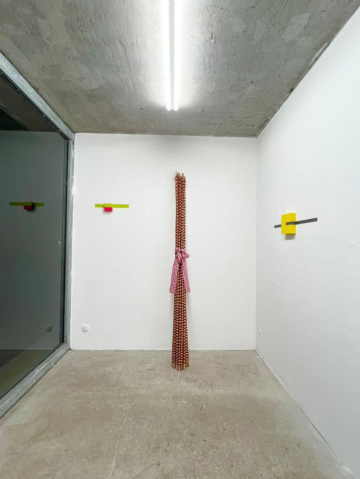 21 Bambusstäbe je 220 cm, per Hand mit Acrylwolle umwickelt, Glasvasen, Sandsäcke