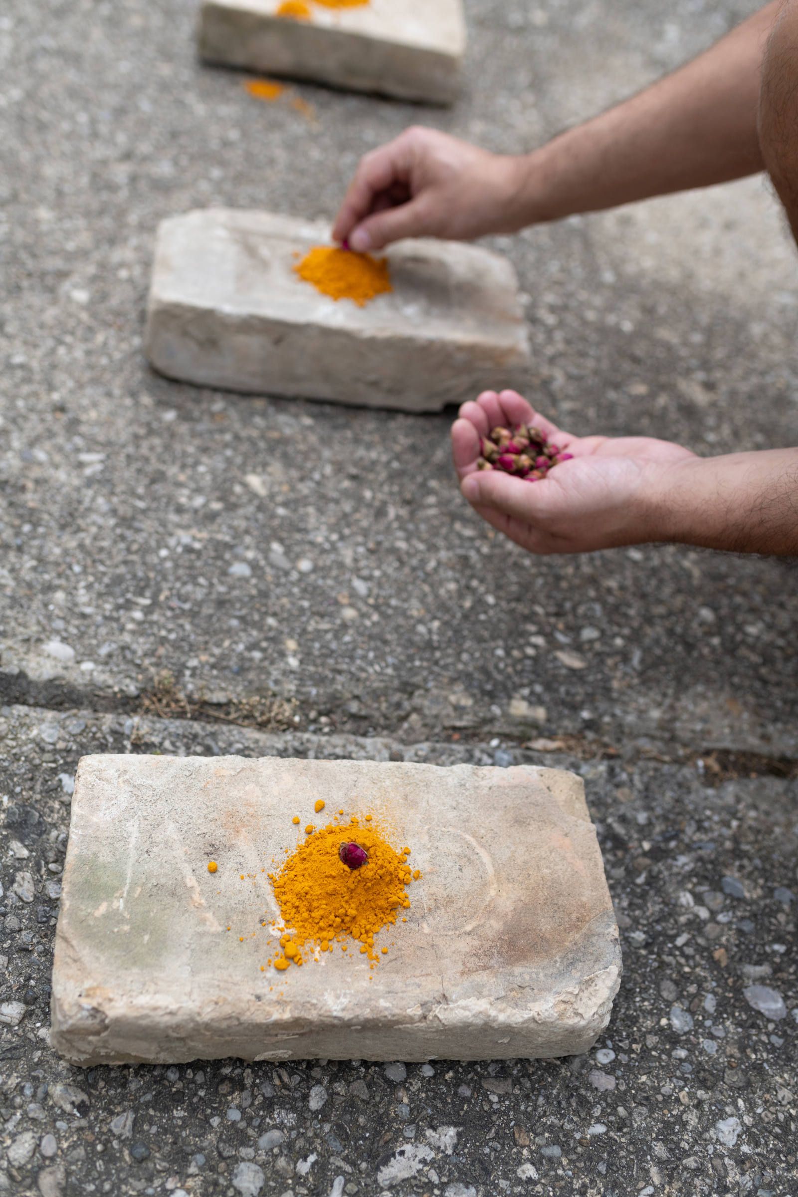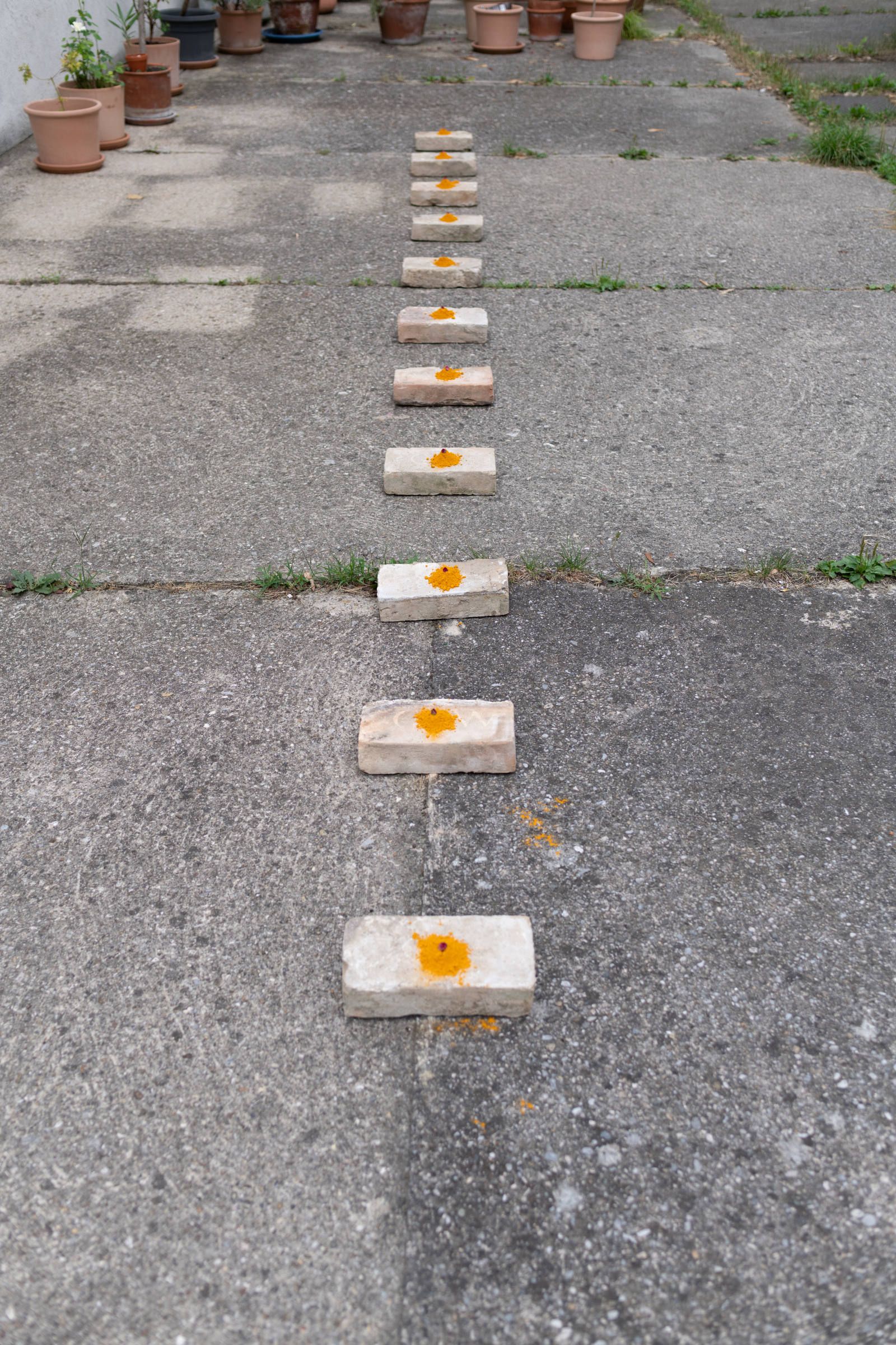 11 Bauziegel, gemahlener Kurkuma, getrocknete Rosenblüten